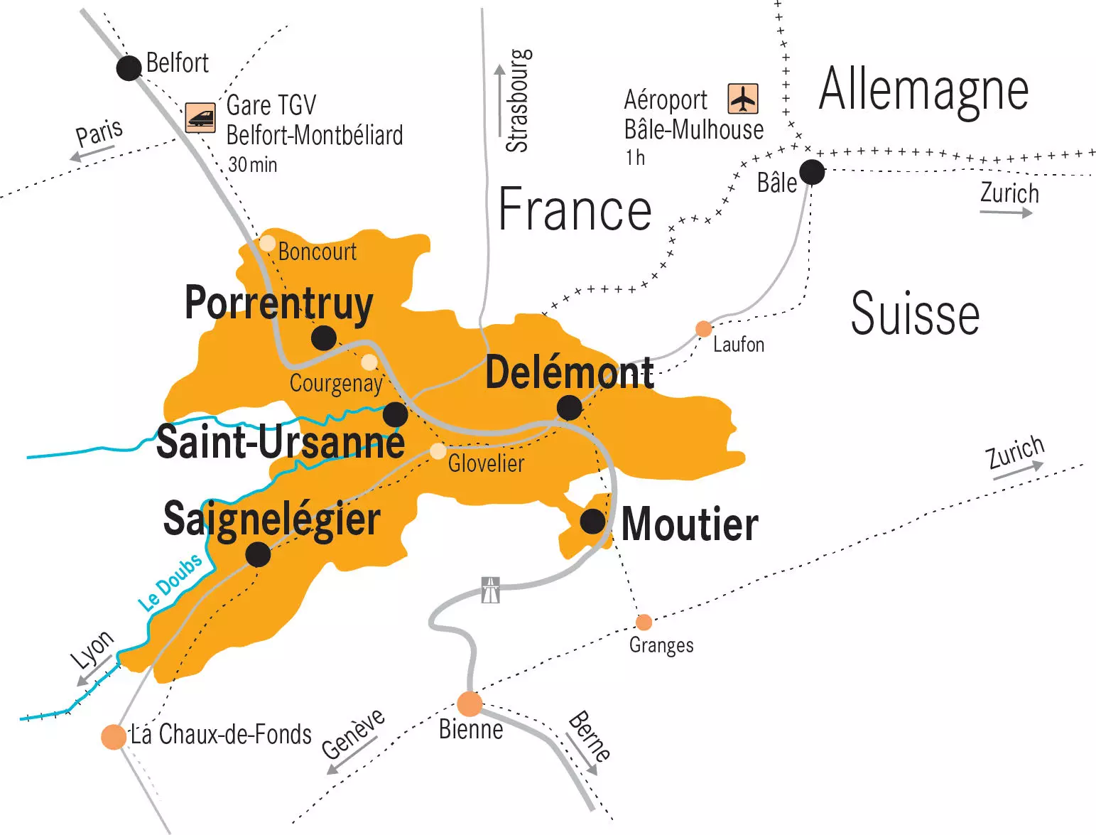 Aéroport Bâle-Mulhouse puis 1 h en voiture jusqu’à Porrentruy